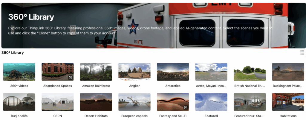 - Prepare an image to play with! Go to the ThingLink 360° image library. Briefly review some of the images and choose one to use as a base image for your first project.